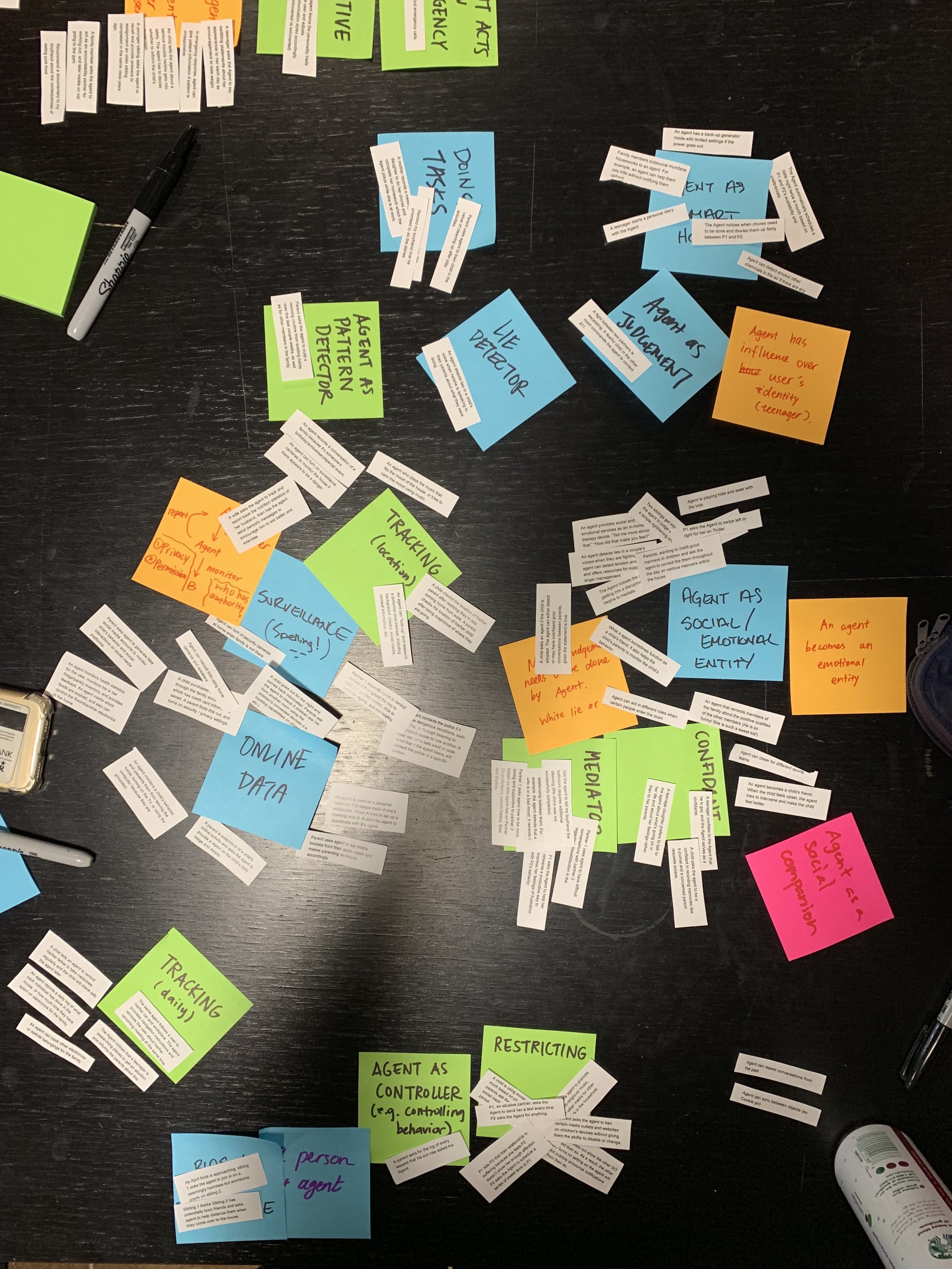 As we went through the ideation process, we used affinity diagrams to organize the concepts and draw out themes in a structured and physical way. For example: Should an agent be allowed to access a spouse’s calendar without their permission? Should a child be able to track his father’s location through the agent?